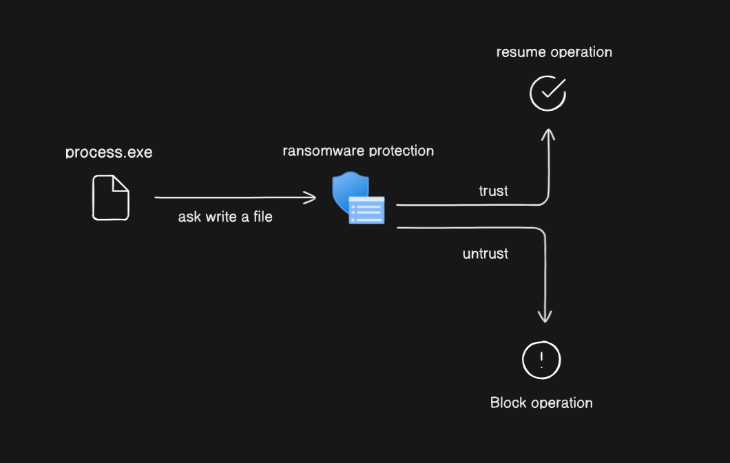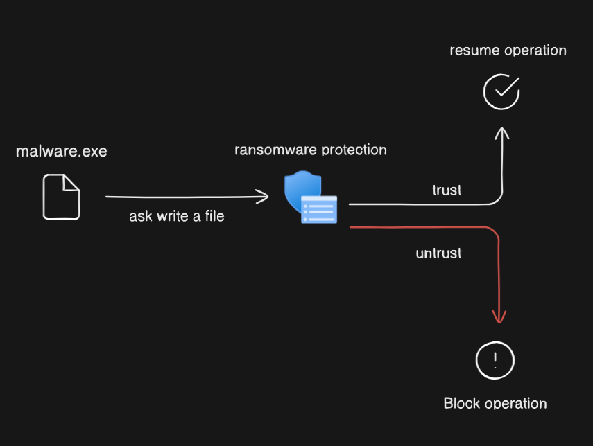الحين يوم عرفنا كيف الحماية شغاله نقدر نستنتج اكثر من طريقة عشان نتخطاها وحده من الطرق اللي جربتها و ضبطت علطول اني اخلي trusted process هي اللي تكتب بالملف بس لو نجرب نكتب ملف في بروسيس مو موثوقة بيصير كذا&#x20;